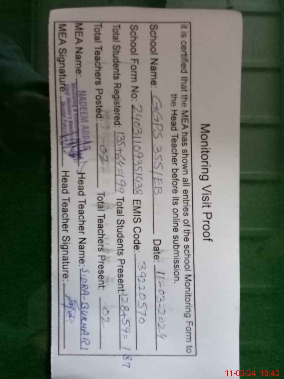 | Attendance Register | Head Teacher | MEA with School | Visit Proof |