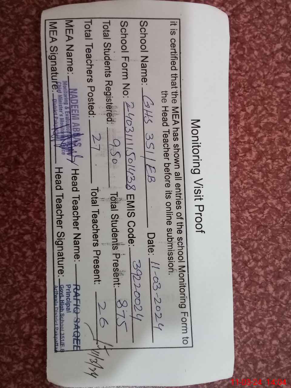 | EMIS Code: 39220024 | Name of School: GHS 351/EB ARIFWALA | |||