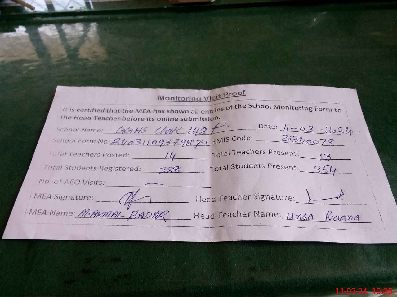 | Monitoring Date: 11-03-2024 | Start Time: 11-03-2024 09:35 AM | End Time: 11-03-2024 10:06 AM | Name of MEA: Mu**** Ak**** Ba**** | |