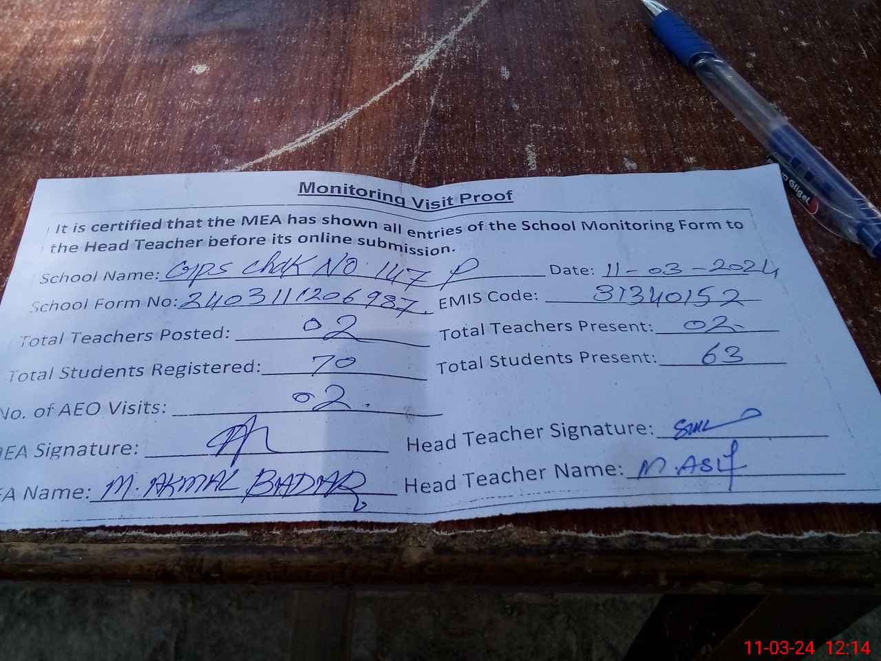 | EMIS Code: 31340152 | Name of School: GPS CHAK NO 147/P | |||