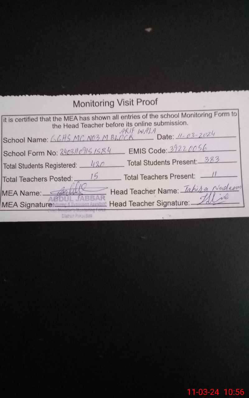 | EMIS Code: 39220056 | Name of School: GGHS MC NO.3 M BLOCK ARIFWALA | |||