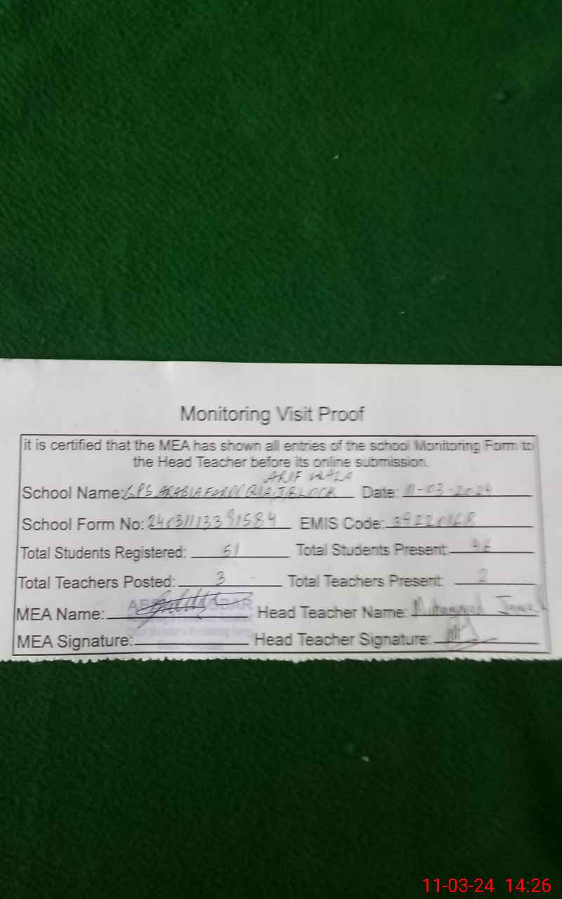 | Certified that this School was Inspected by the Undersigned MEA/DMO Today and the Information Stated Above is as Per Record. | |||||