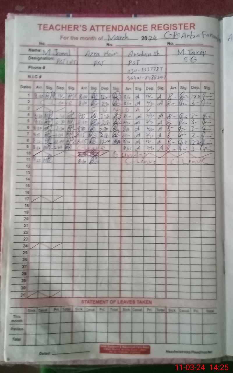 | CNIC | Full Name | Designation | R/C | Absence During Last Calender Month |