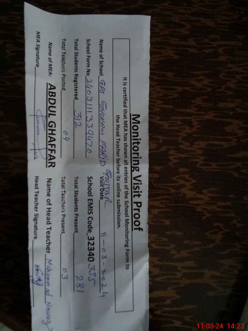 | EMIS Code: 32340335 | Name of School: GPS GHULAM FARID GUJJAR | |||