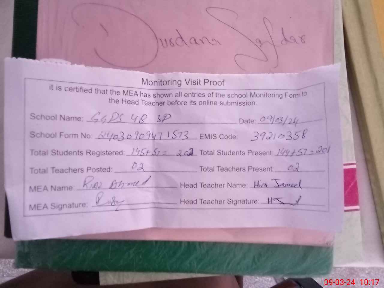 | Attendance Register | Head Teacher | MEA with School | Visit Proof |