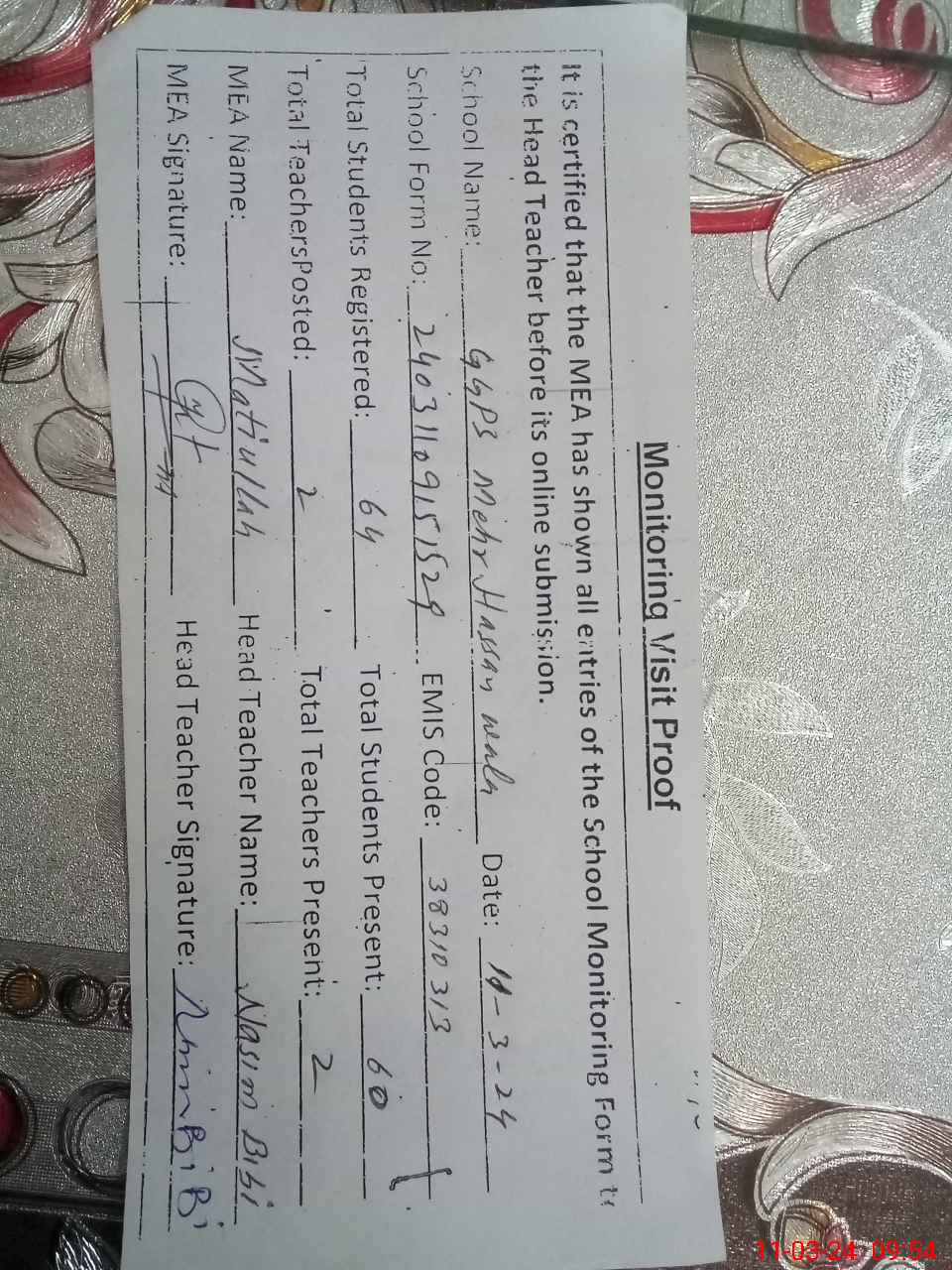 | Attendance Register | Head Teacher | MEA with School | Visit Proof |