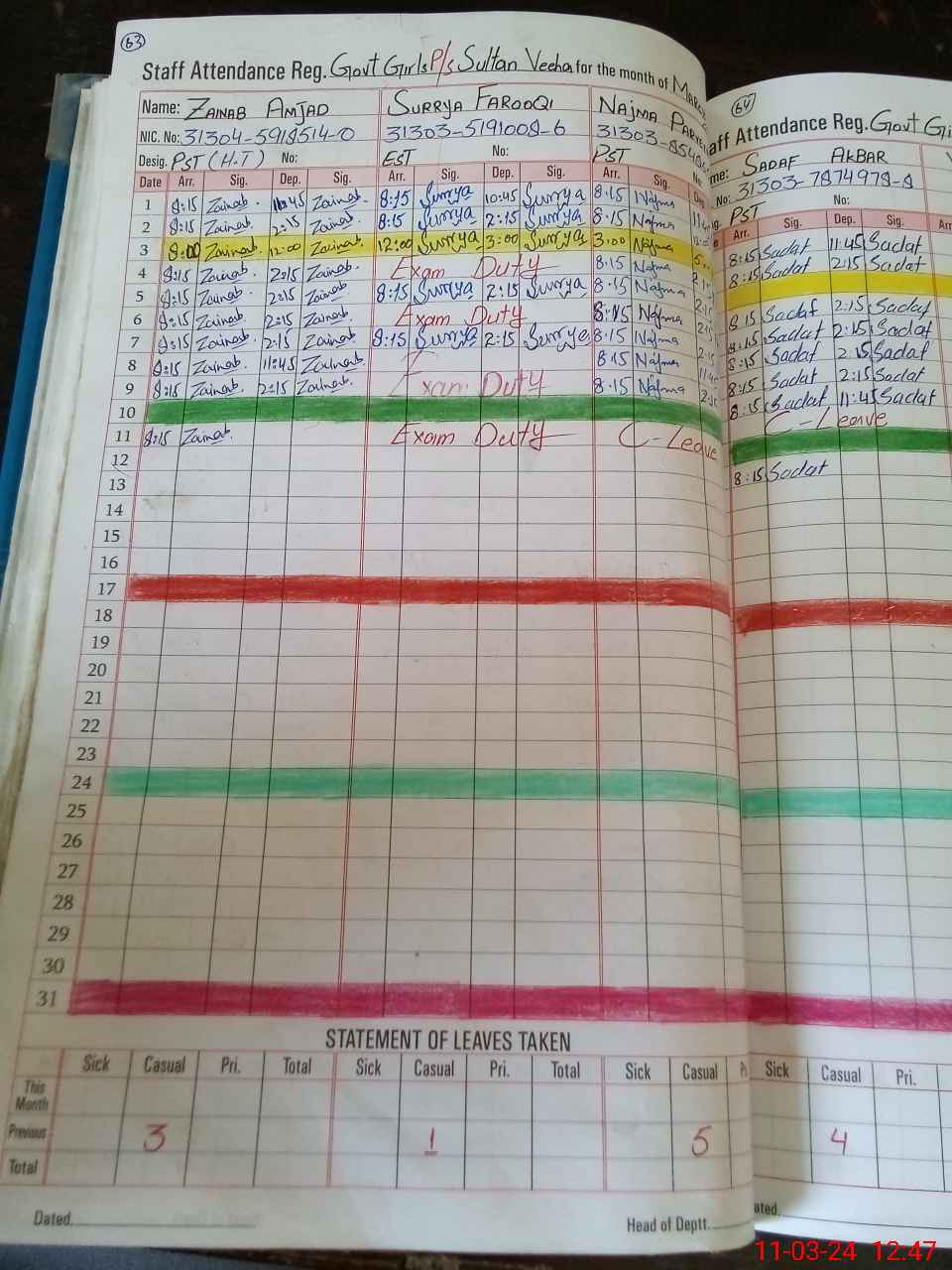| 31**** | Su**** Fa**** | Regular | 0 | 6 | 0 | 0 | 0 | 0 | 0 | 0 | 0 | Exam Duty | |