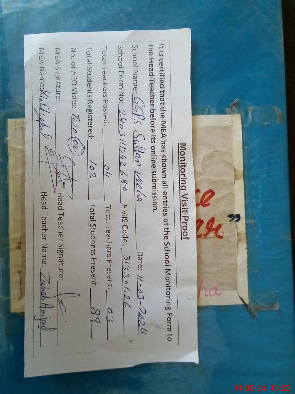 | Attendance Register | Head Teacher | MEA with School | Visit Proof |