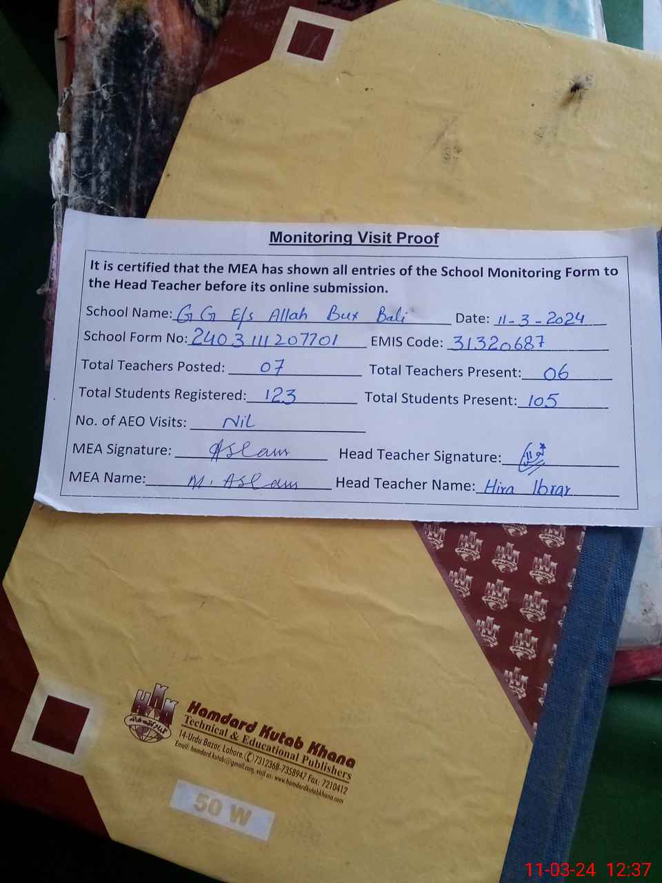 | Attendance Register | Head Teacher | MEA with School | Visit Proof |