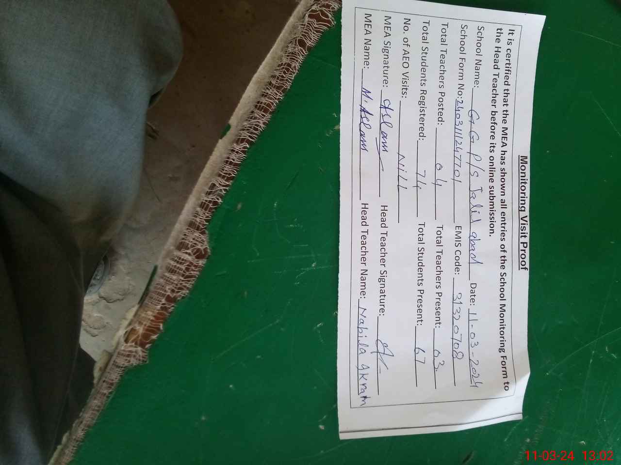 | Attendance Register | Head Teacher | MEA with School | Visit Proof |