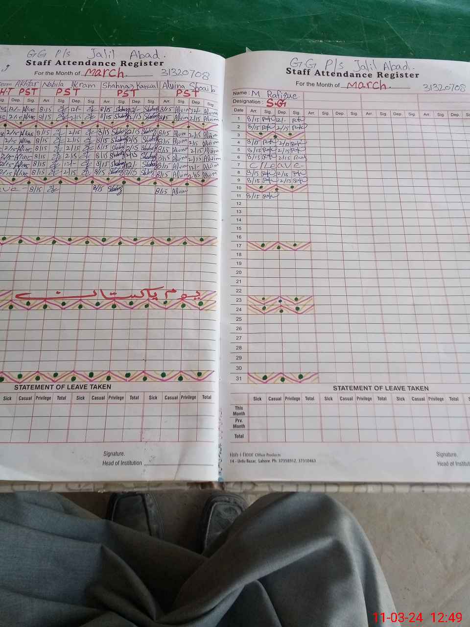 | CNIC | Full Name | Designation | R/C | Absence During Last Calender Month |