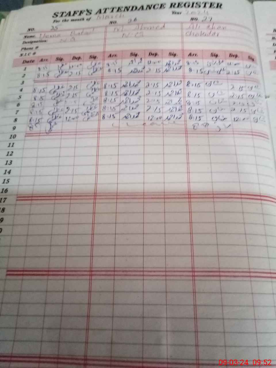 | CNIC | Full Name | Designation | R/C | Absence during last cal. month |