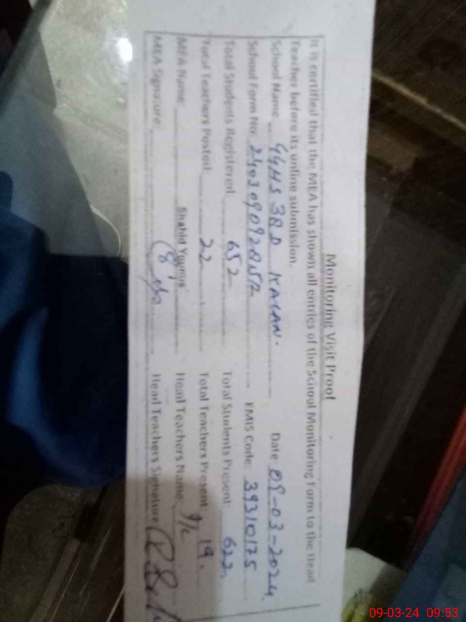 | Name: NU**** SU**** Designation: (School Headmaster's/Headmistress's) SHM Phone/Cell Number: 03**** |