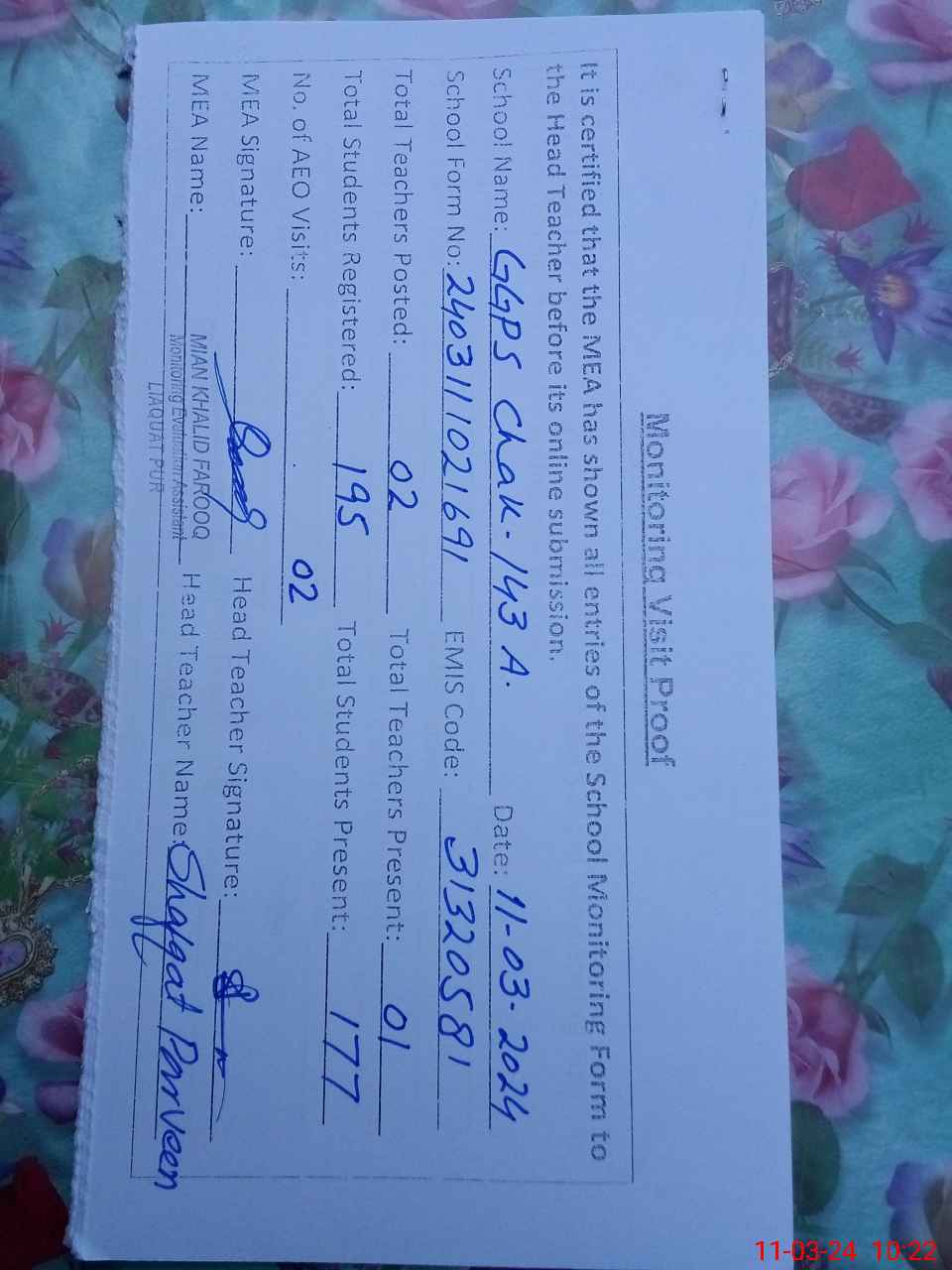 | Attendance Register | Head Teacher | MEA with School | Visit Proof |