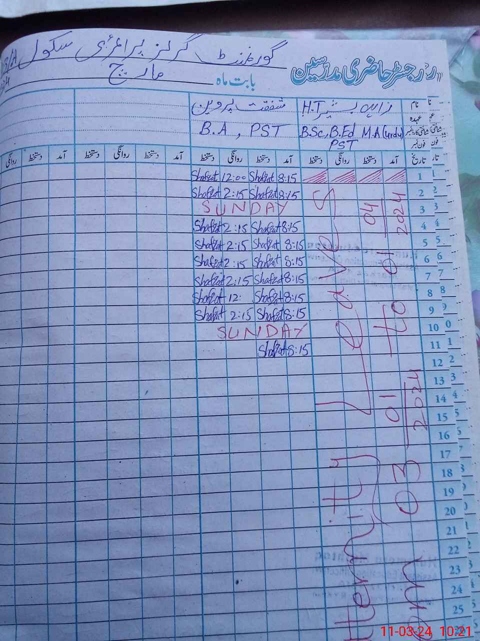 | Name: Za**** Ba**** Designation: (School Headmaster's/Headmistress's) PST Phone/Cell Number: 03**** |