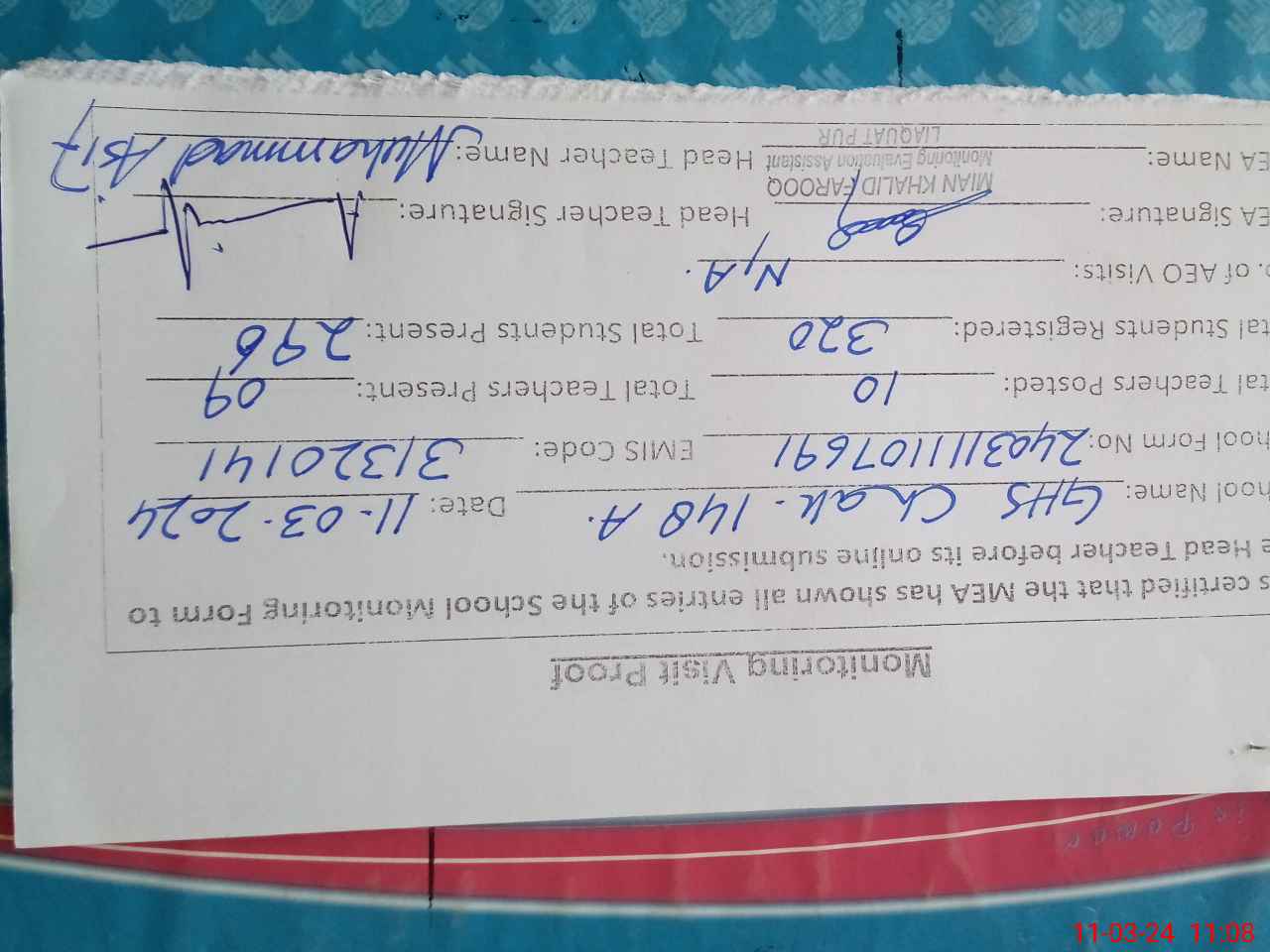 | Attendance Register | Head Teacher | MEA with School | Visit Proof |