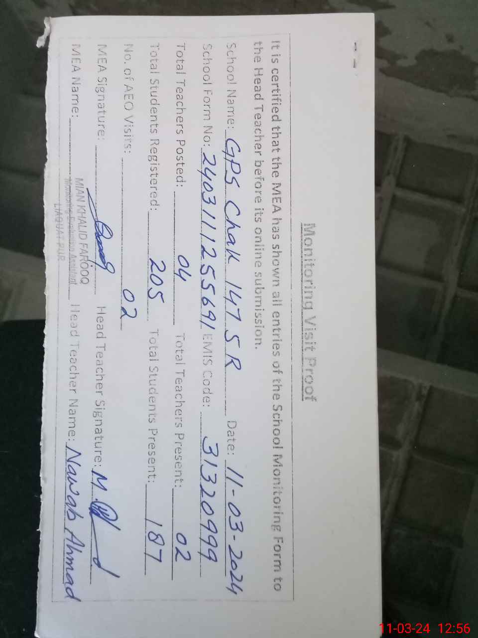 | Attendance Register | Head Teacher | MEA with School | Visit Proof |