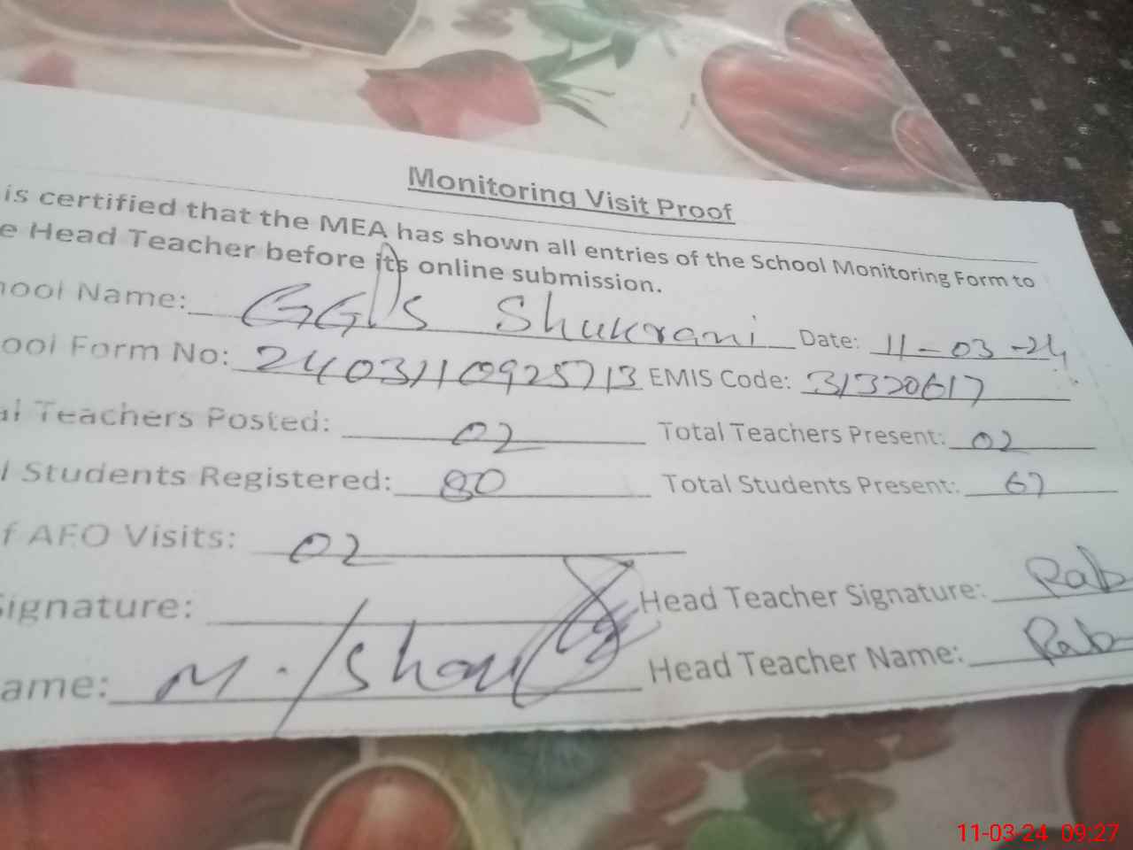 | Attendance Register | Head Teacher | MEA with School | Visit Proof |