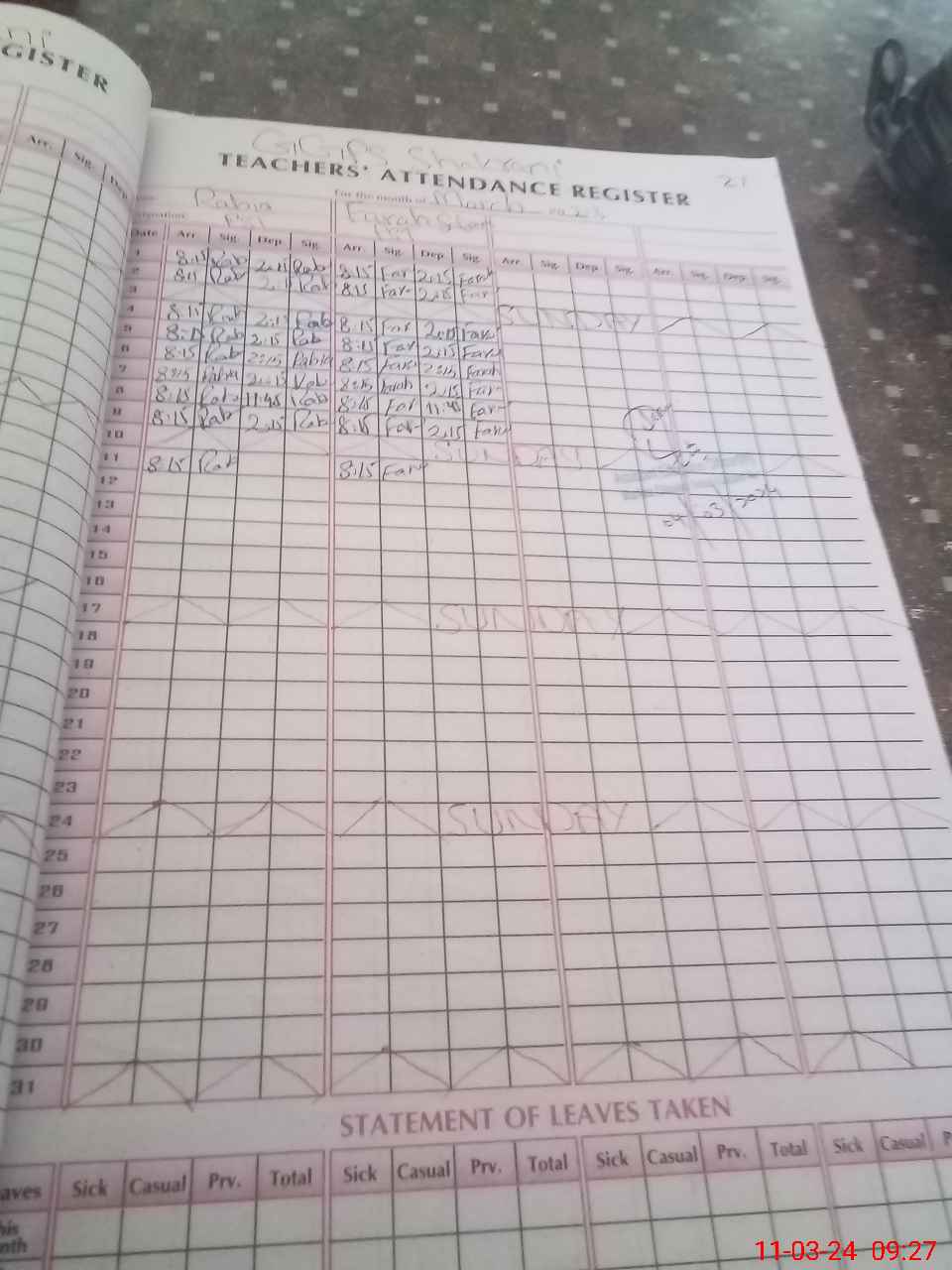 | Leave | Duty | Absent | Maternity | Medical | Ex- Pak |