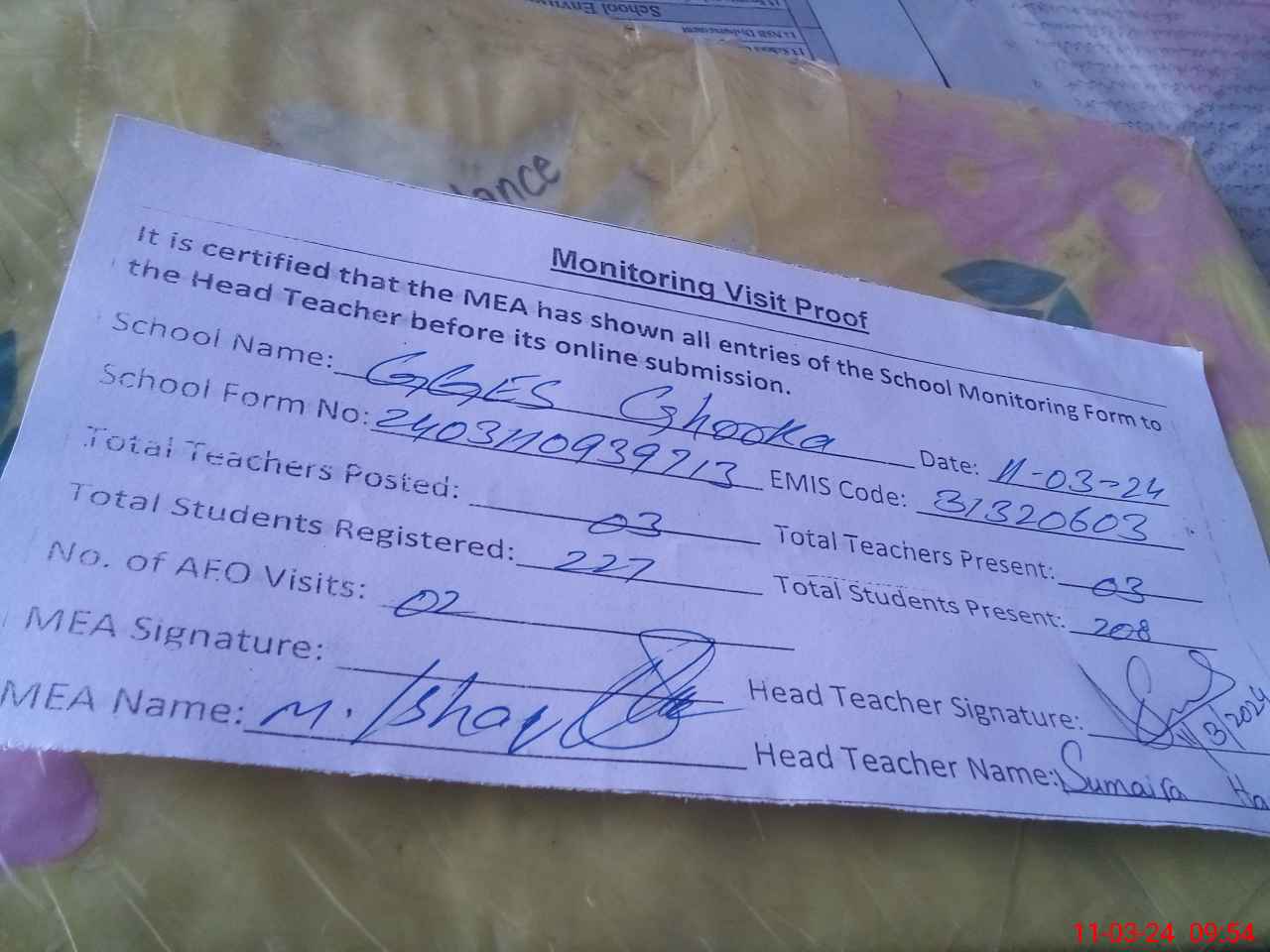 | Attendance Register | Head Teacher | MEA with School | Visit Proof |