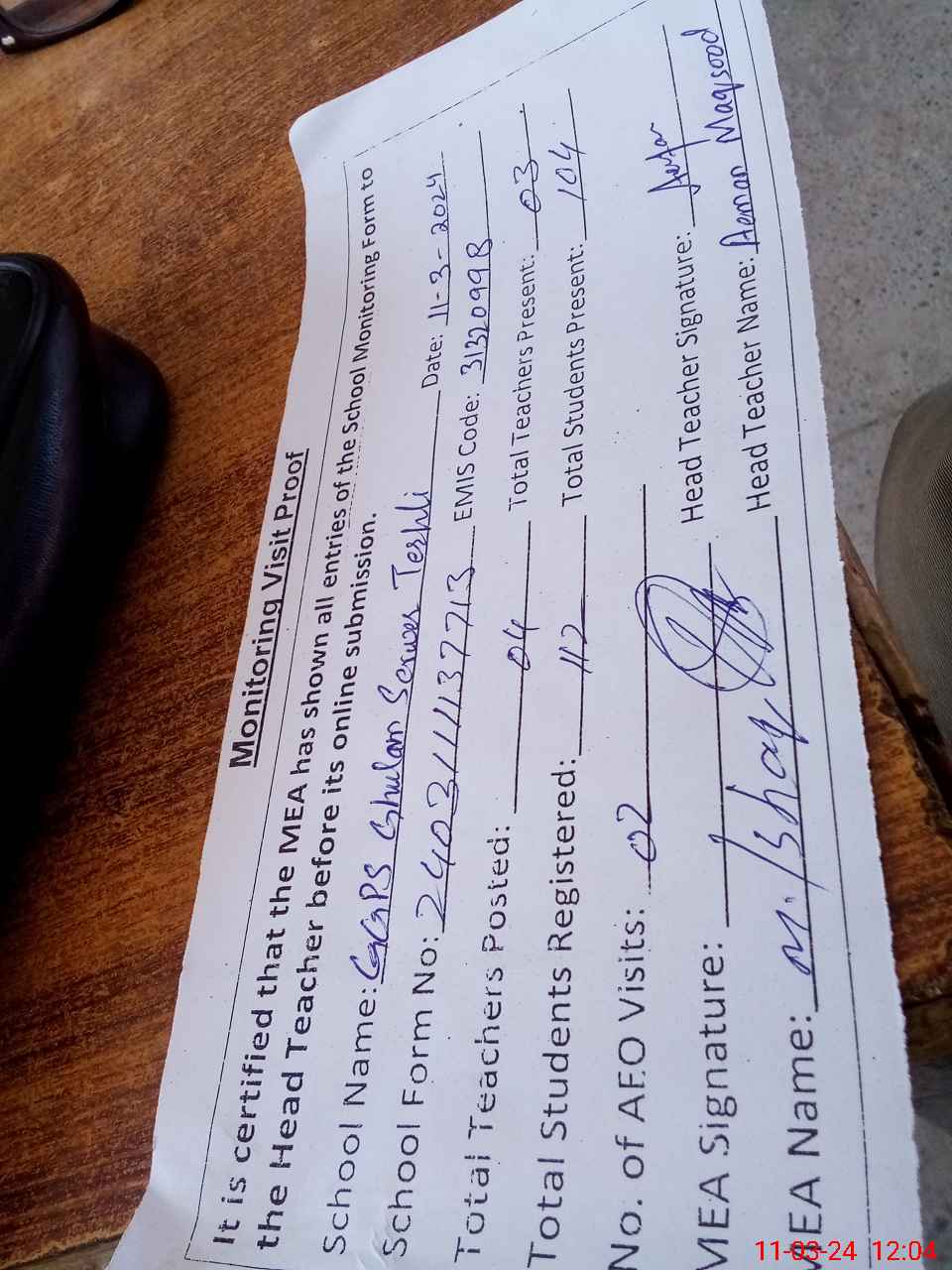 | Attendance Register | Head Teacher | MEA with School | Visit Proof |
