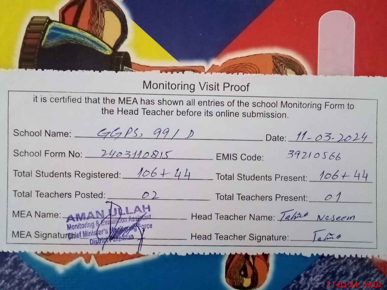 | EMIS Code: 39210566 | Name of School: GGPS 99/D | |||