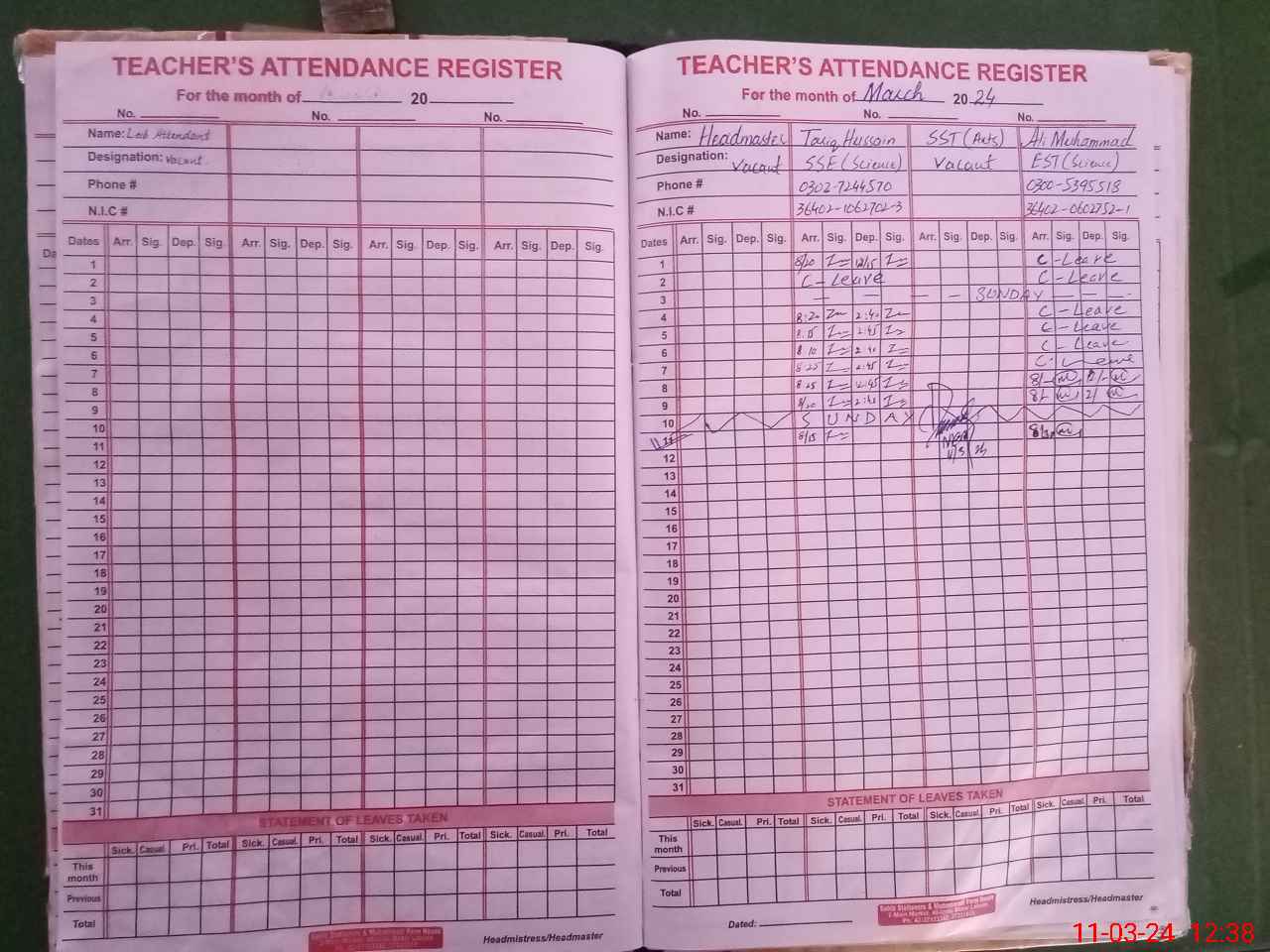 | CNIC | Full Name | Designation | R/C | Absence During Last Calender Month |