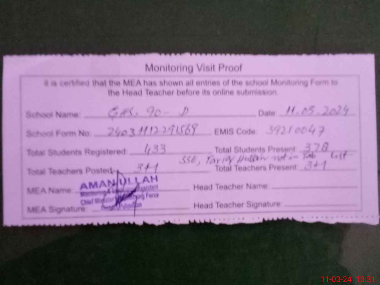 | Attendance Register | Head Teacher | MEA with School | Visit Proof |