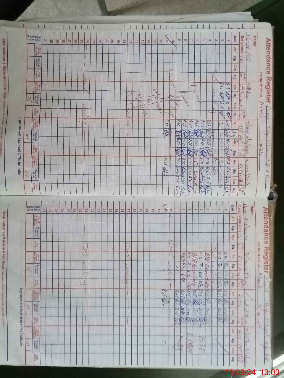 | Remarks (Use Separate Page if Required): AFSHAN SST SC NO EARNED LEAVE PROOF STARTING FROM 04 MARCH 2024 TO 16 MARCH 2024 AND SHAHEEN KAUSAR PST NO CASUAL LEAVE PROOF ON 11 MARCH 2024 ARE AVAILABLE UMME KALSOOM EST GENERAL ALSO FOUND UN AUTHORISED STAFF ATTENDANCE REGISTER COLUMNS WERE LEFT BLANK MUHAMMAD ASAD UR REHMAN JC FOUND UN AUTHORISED FROM 25 SEPTEMBER 2023 TO TILL FTF RECORDS ARE NOT MAINTAINED ALL HAND WASHING POINTS ARE WITHOUT SOAP RANDOM CLASS NINE IS PASSED OUT FROM THIS SCHOOL | |||||