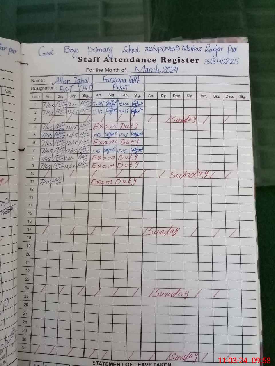 | 31**** | Fa**** La**** Bh**** | 1 | 0 | 0 | 0 | 0 | 0 | 0 | 0 | 0 | 0 | Exam Duty | |