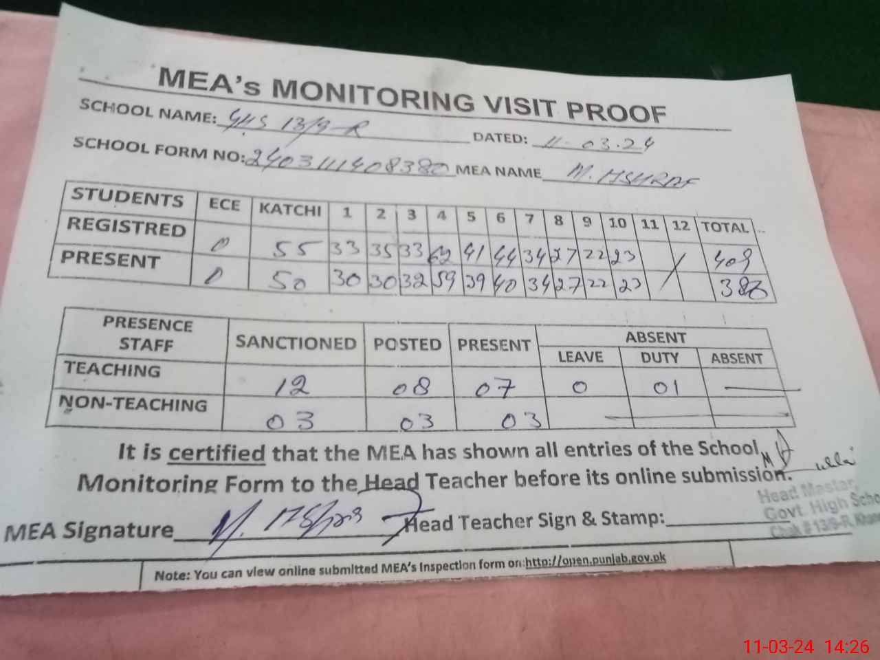 | EMIS Code: 36420074 | Name of School: GHS 13/9-R, KACHA KHUH | |||