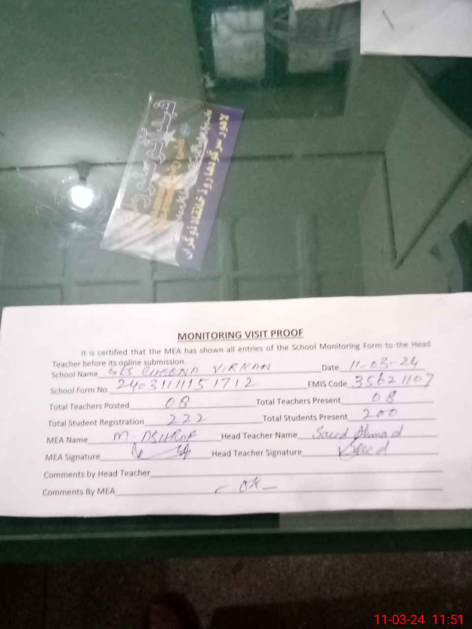 | Attendance Register | Head Teacher | MEA with School | Visit Proof |