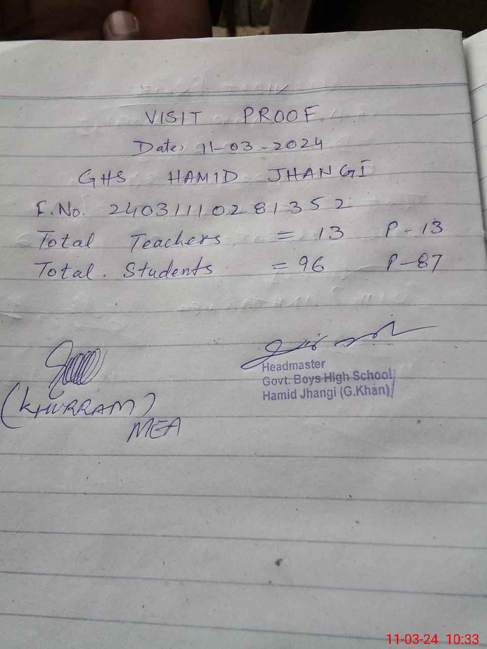 | Attendance Register | Head Teacher | MEA with School | Visit Proof |