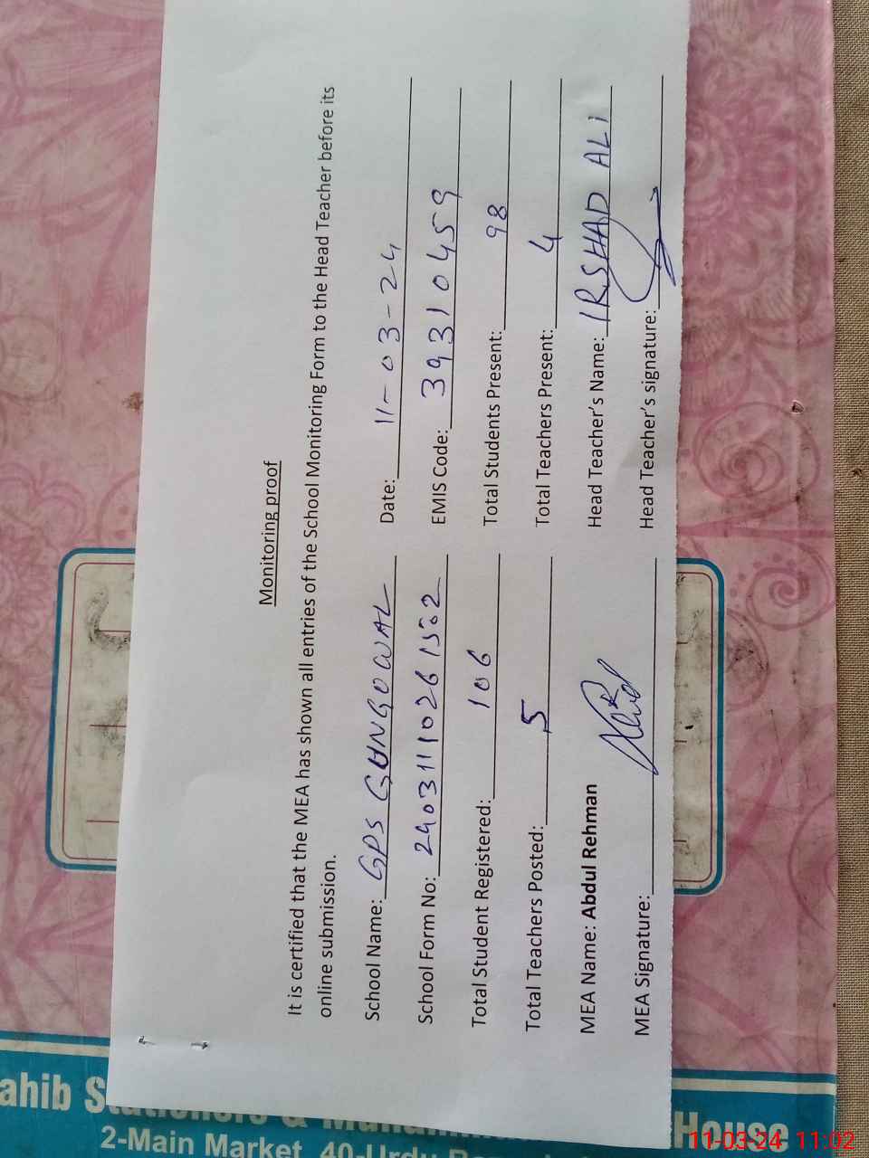 | EMIS Code: 39310459 | Name of School: GPS GUNGOO WAL | |||