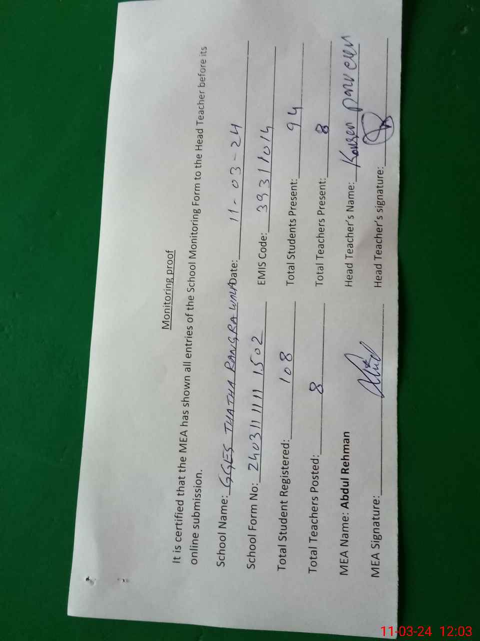 | Attendance Register | Head Teacher | MEA with School | Visit Proof |