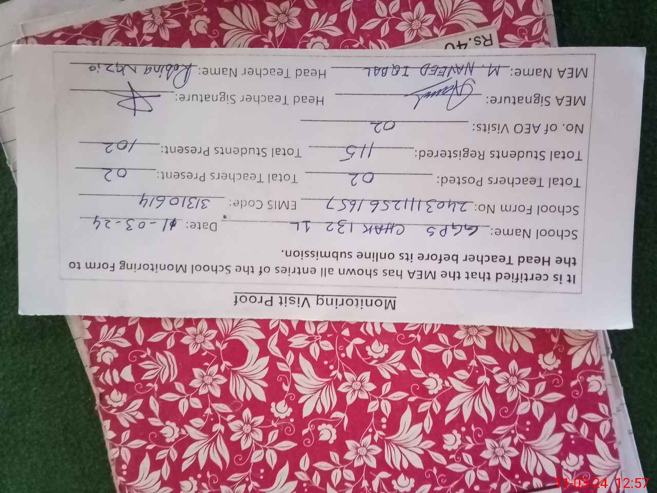 | Attendance Register | Head Teacher | MEA with School | Visit Proof |