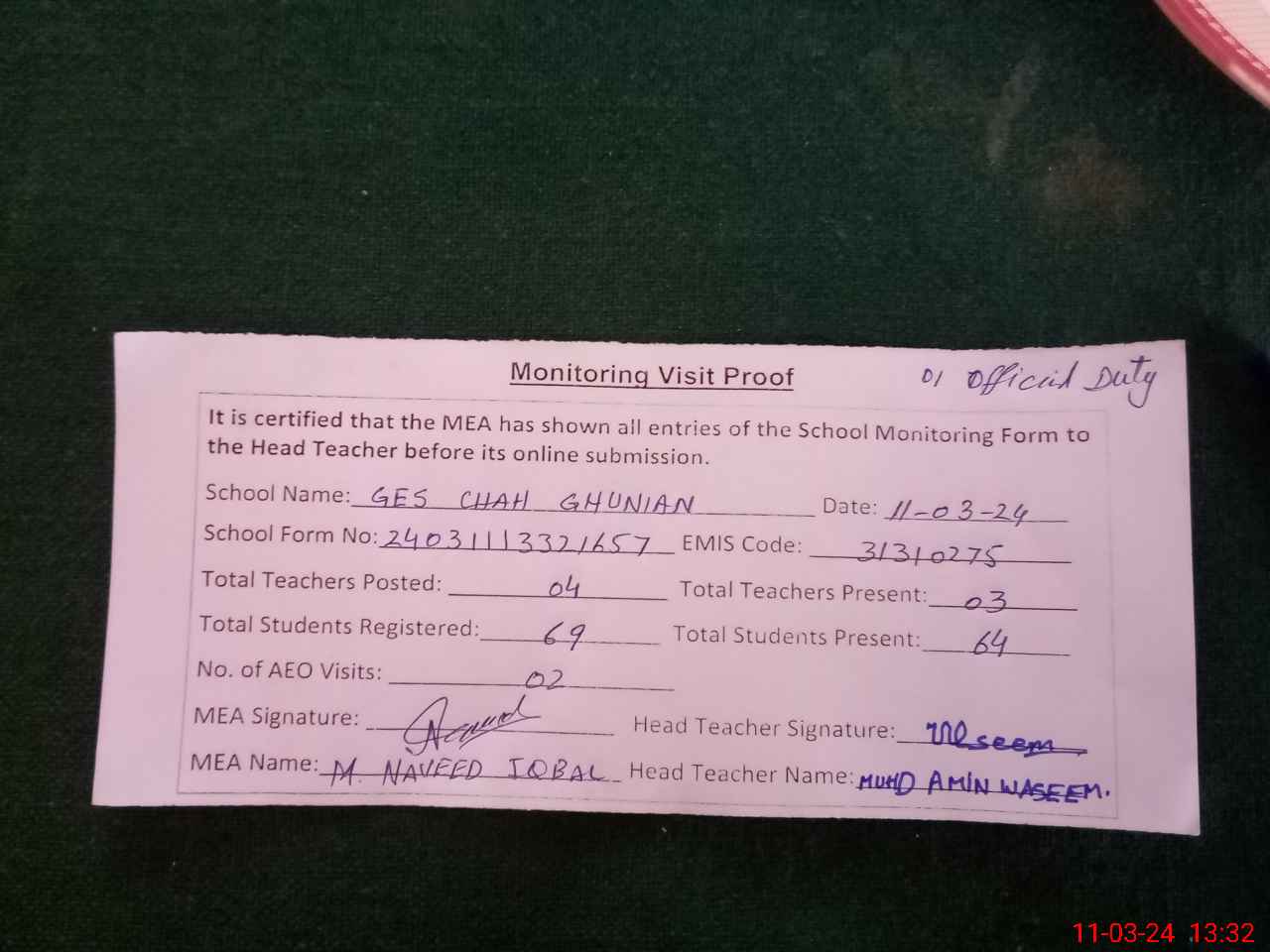 | EMIS Code: 31310275 | Name of School: GES CHAH GHUNIAN | |||