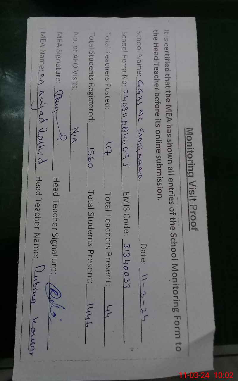 | EMIS Code: 31340033 | Name of School: GGHS MC SADIQ ABAD | |||