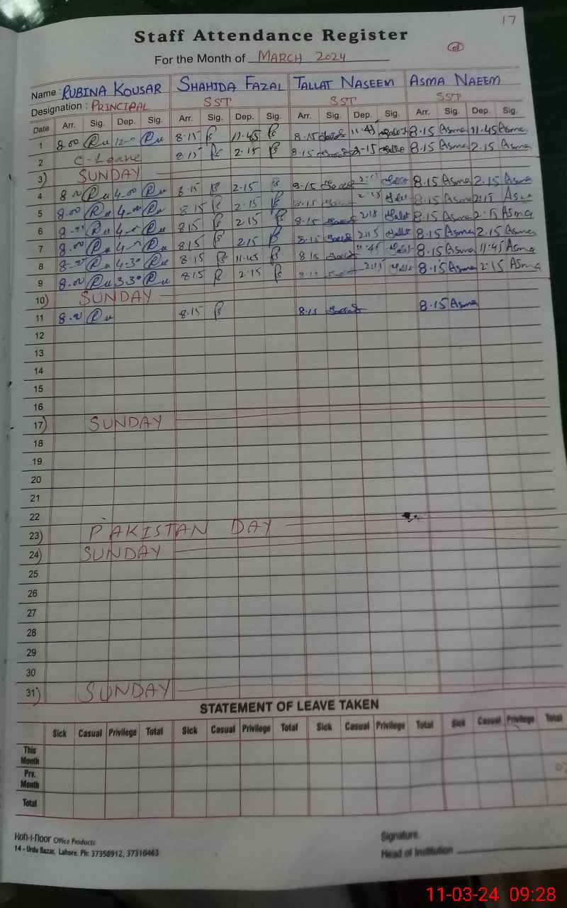 | Remarks (Use Separate Page if Required): PST Nazia sehar and EST Sadia sarwar marked absent as their sanctioned leave not produced at the time of inspection | |||||