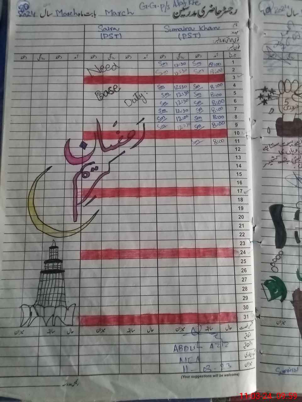 | CNIC | Full Name | Designation | R/C | Absence During Last Calender Month |