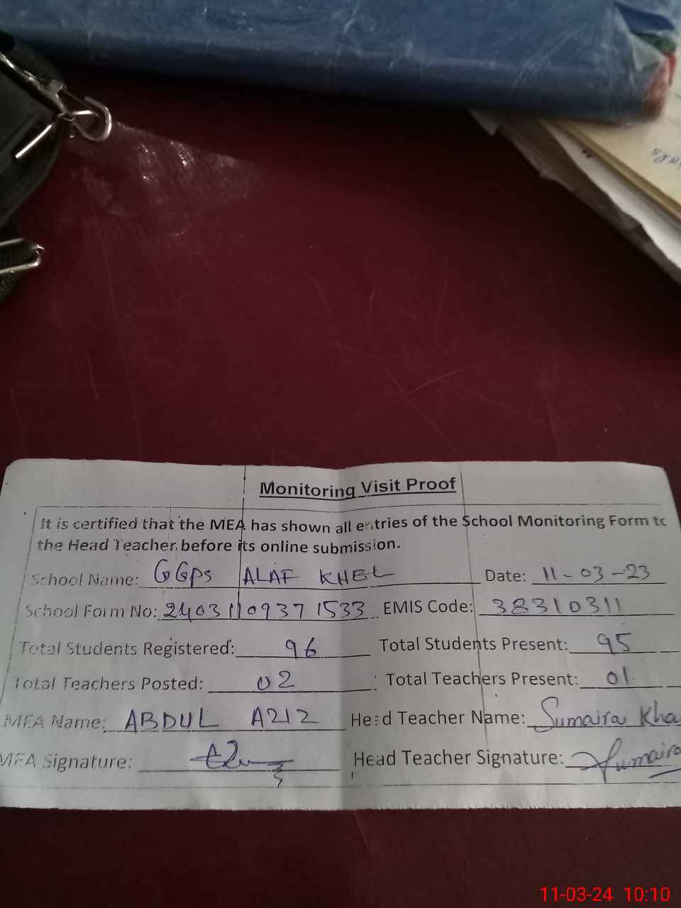| Attendance Register | Head Teacher | MEA with School | Visit Proof |