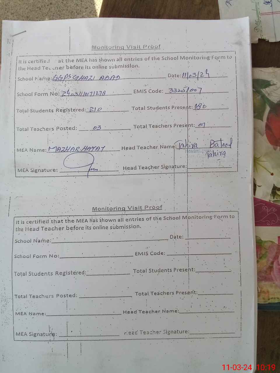 | Certified that this School was Inspected by the Undersigned MEA/DMO Today and the Information Stated Above is as Per Record. | |||||