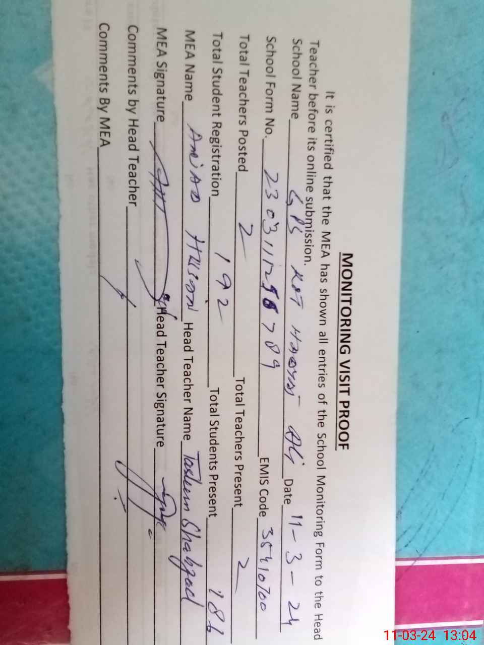 | Attendance Register | Head Teacher | MEA with School | Visit Proof |