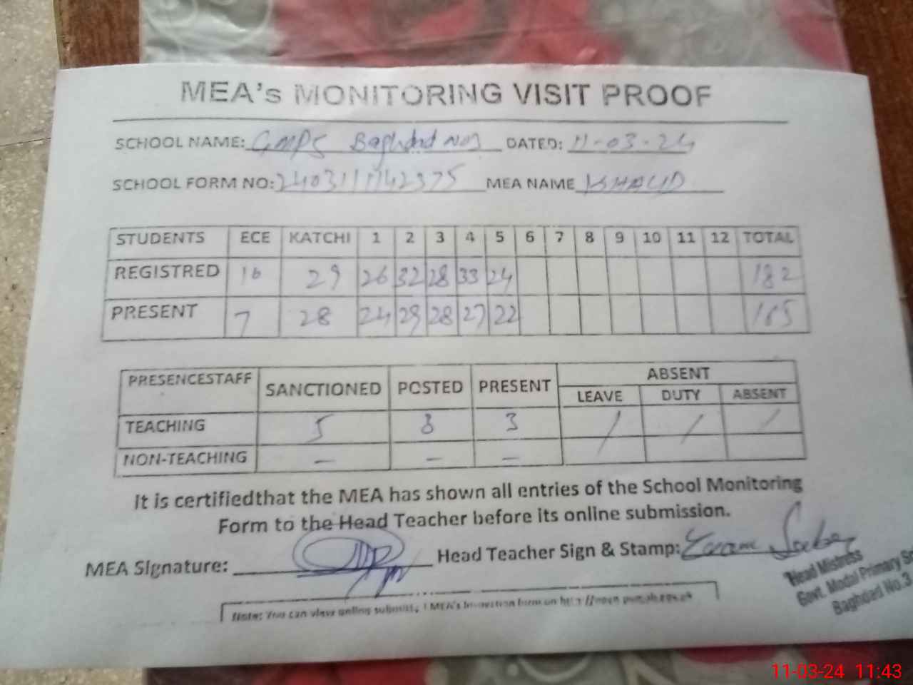 | Attendance Register | Head Teacher | MEA with School | Visit Proof |