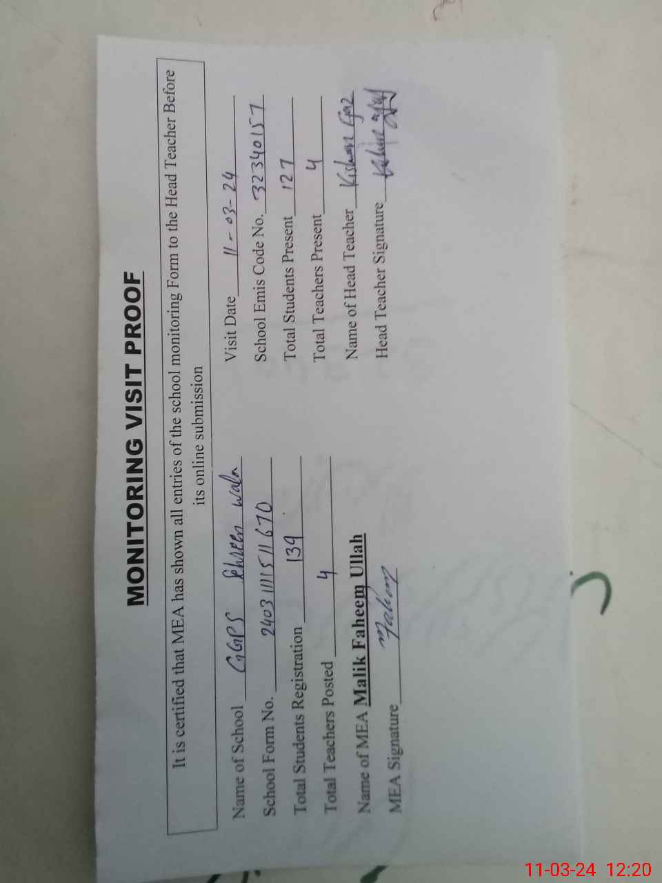 | Attendance Register | Head Teacher | MEA with School | Visit Proof |