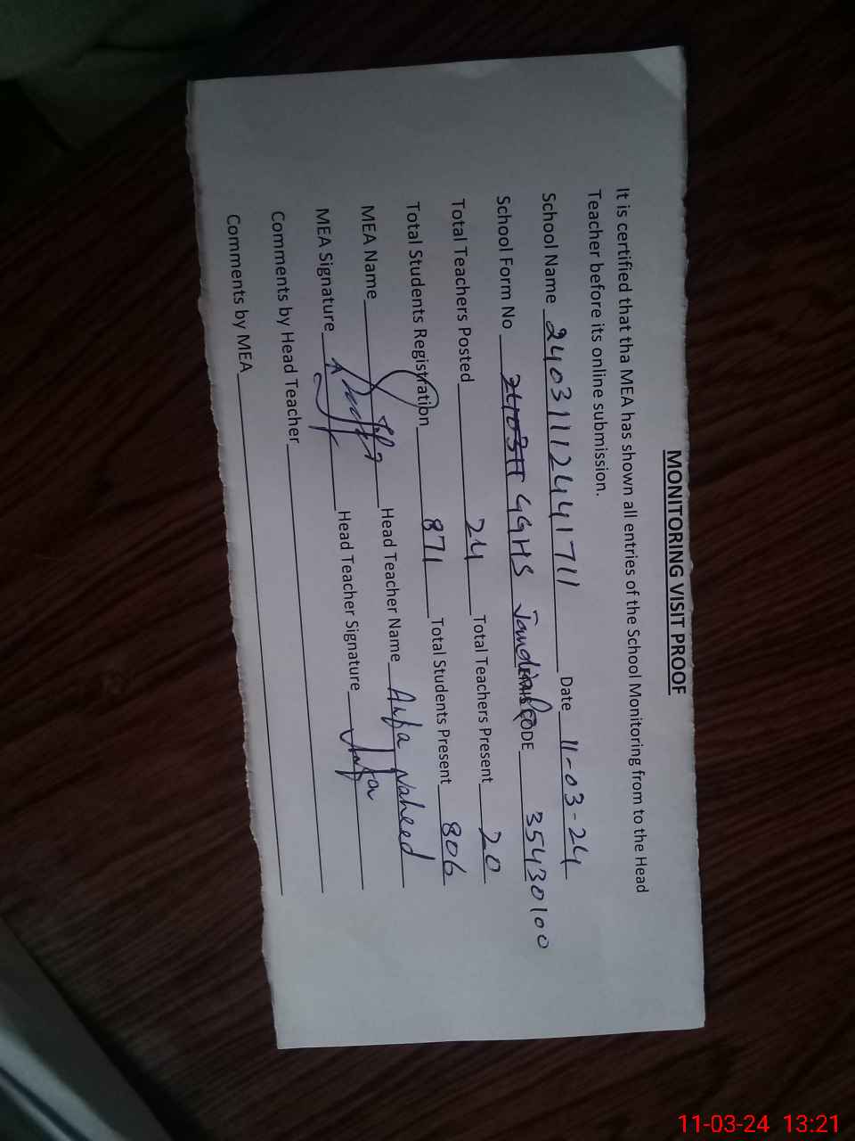 | Attendance Register | Head Teacher | MEA with School | Visit Proof |