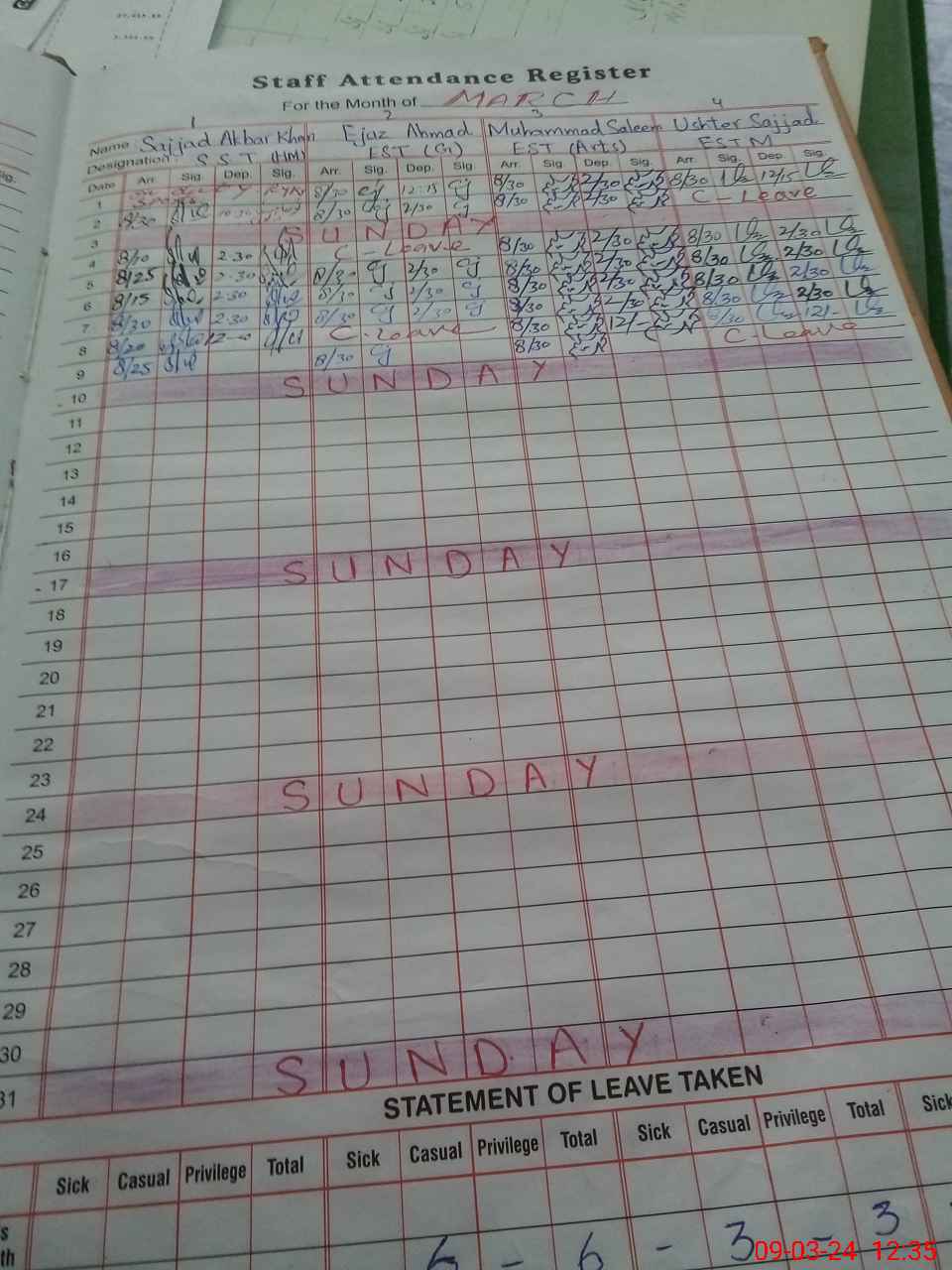 | CNIC | Full Name | Designation | R/C | Absence During Last Calender Month |