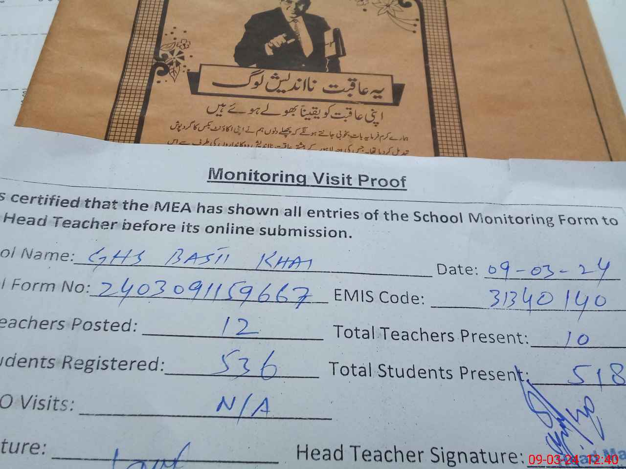 | Attendance Register | Head Teacher | MEA with School | Visit Proof |