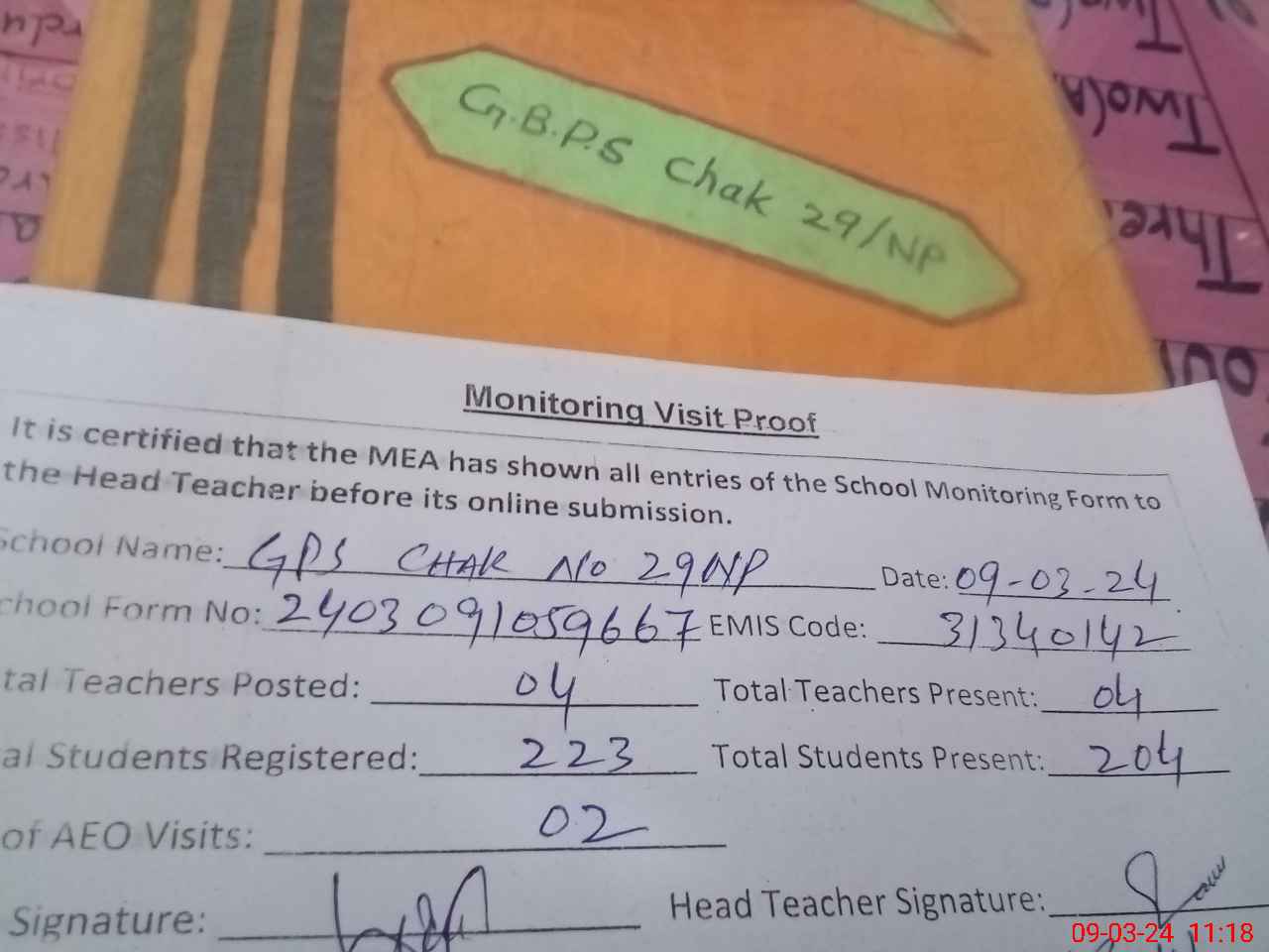 | EMIS Code: 31340142 | Name of School: GPS CHAK NO. 29/NP | |||