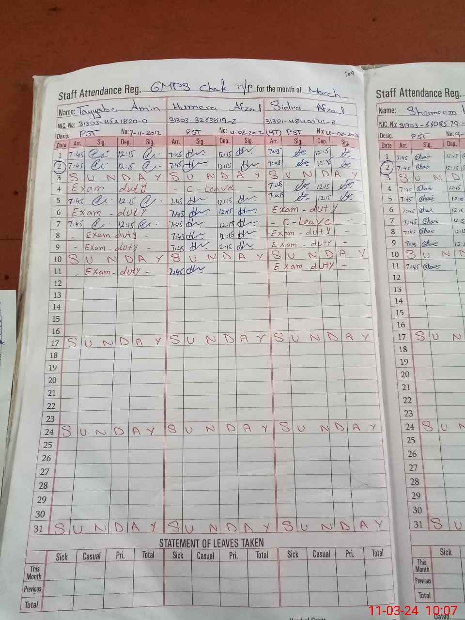 | 31**** | Mu**** Kh**** | 1 | 1 | 0 | 0 | 0 | 0 | 0 | 0 | 0 | 0 | 0 | Exam Duty |